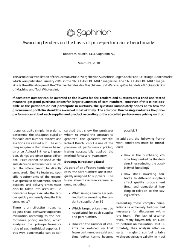 Awarding tenders on the basis of price-performance benchmarks